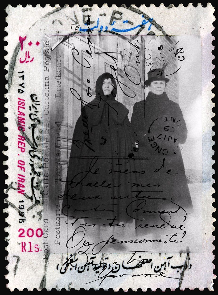 À la recherche de leur identité, des timbres anciens, toujours conscients de leur origine, se lancent dans une aventure abstraite. Remplacer leur contenu par des photos d’une époque passée, pour créer une ambiguïté et un cachet nébuleux. Les timbres deviennent le support des textes des cartes postales anciennes, outil convivial de communication de leur temps.